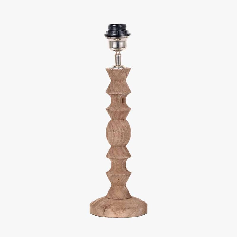 Håndlaget bordlampe i mango-tre med rustikk eleganse og moderne design. Perfekt for nøytrale interiører, og kan kombineres med lin- eller bomullsskjermer for et tidløst uttrykk. Anbefalt skjerm: 35 cm.