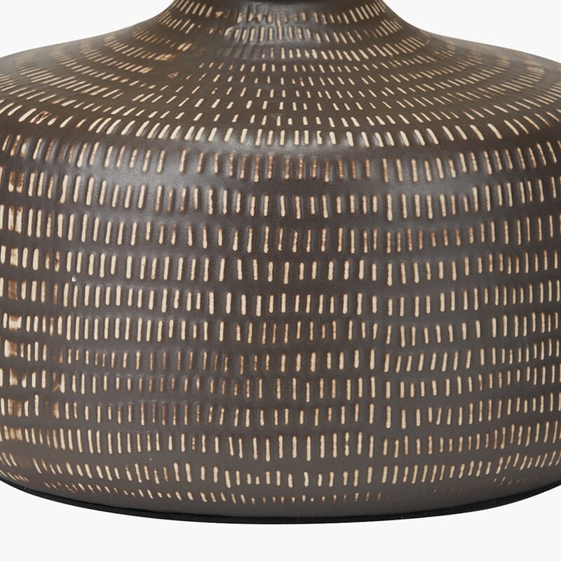 Allsidig keramisk bordlampe i jordbrun med teksturert finish og subtilt ripesdesign. Fullført med natur farget skjerm.
