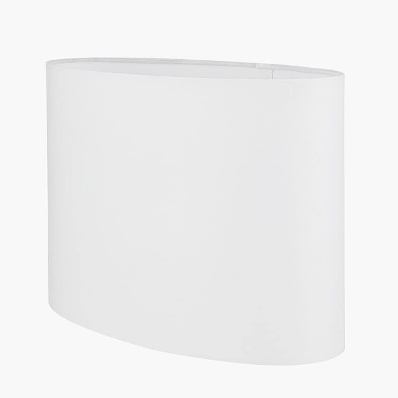 Denne stilige, 35 cm ovale lampeskjermen er laget av et nøytralt ivorifarget bomullsblandingsstoff. Den er foret for å gi et varmt, innbydende lys når den er tent. Den perfekte størrelsen for lamper på konsollbord eller i mindre rom.