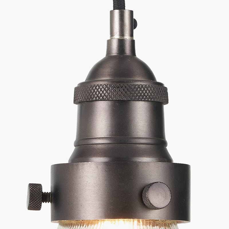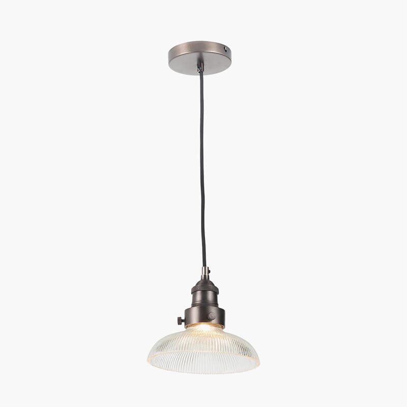 Denne pendellampen i ribbet glass tilfører et unikt, industrielt preg til rommet. Med sin antikk bronsekrone er den den perfekte kombinasjonen av moderne eleganse og tidløs design.