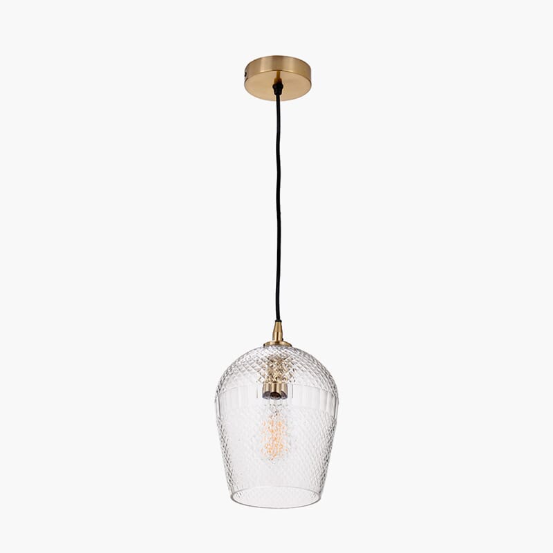 Skap et elegant rom med Giselle Diamond Design Clear Handcut Glass Pendant. Håndlaget i India, med et tidløst diamantmønster i klart glass og antikk messingarmatur – et sofistikert preg som løfter interiøret.