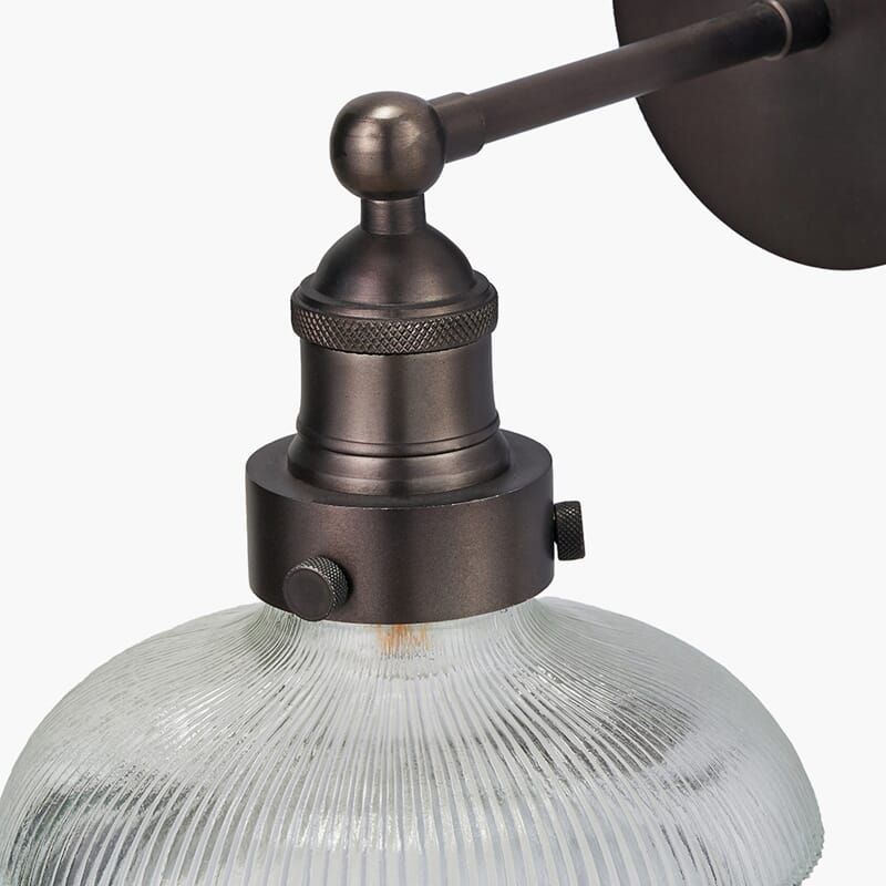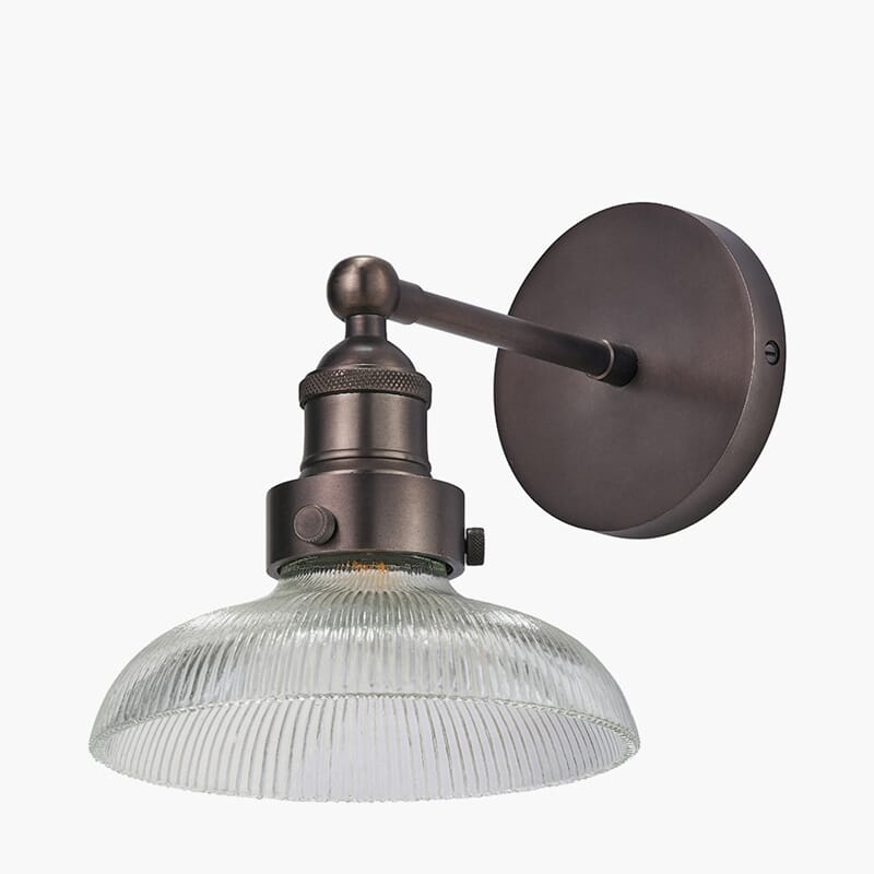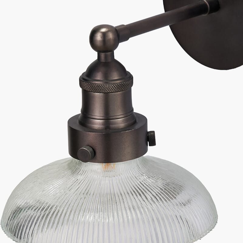Bowery ribbestrukturerte glassvegglampe kombinerer moderne eleganse med industriell stil. Håndlaget i India, med en klar glasskuppel og antikk messingarmatur, er den et iøynefallende tillegg til ethvert rom.