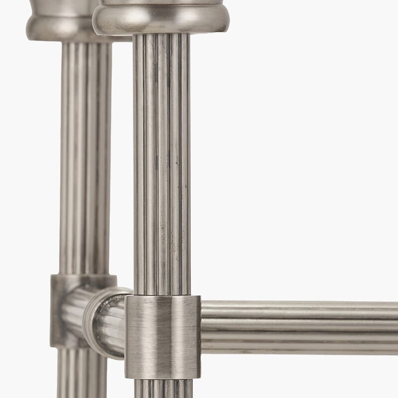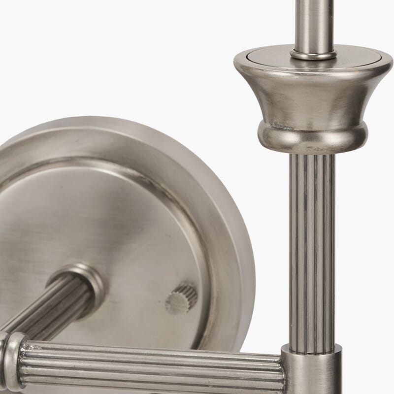 Håndlaget i India, med en antikk sølvfinish, ribbestruktur og trinnet veggplate, tilfører den en elegant touch til ethvert rom. Denne allsidige dobbeltvegglampen leveres uten skjermer.