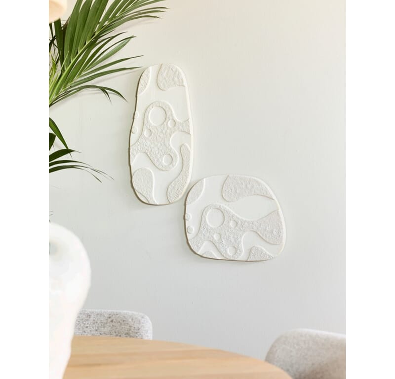Veggdekorasjon i kjeramikk med struktur og lett perlemoreffekt. Madeline finnes i 3 ulike varianter - et flott og effektfullt alternativ til tradisjonelle bilder.