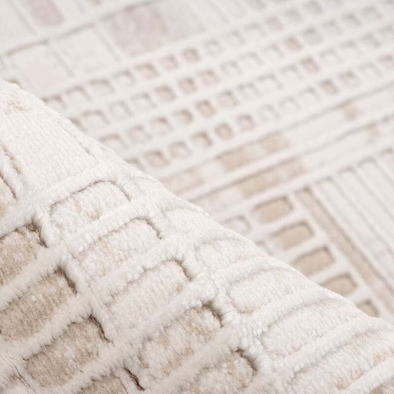 Gulvteppe i polyester med mønster i duse nyanseforskjeller i farge samt forhøyninger i vev.
