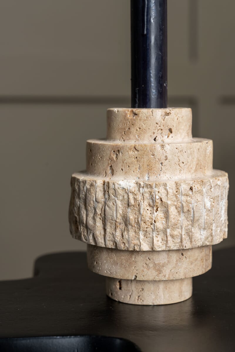 Lysestake i travertine marmor. Den porøse travetine marmoren har lekre sjatteringer fra hvit og creme, til lys rust og ulike nyanser av valnøttbrun, gyllen gul og sølvgrå.