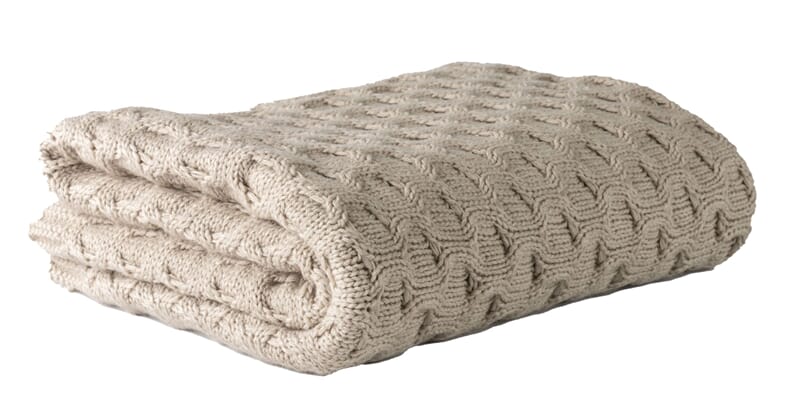 Strikket pledd i beige - myk akryl. Firkant-mønster.