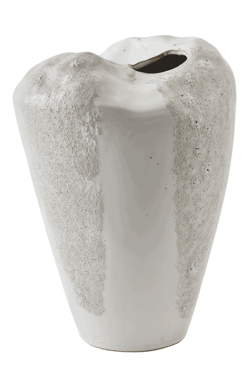 Nydelig håndlaget vase i kjeramikk, med strukturer som kontraster. Lett perlemoreffekt stedvis som gir et touch av glamour.