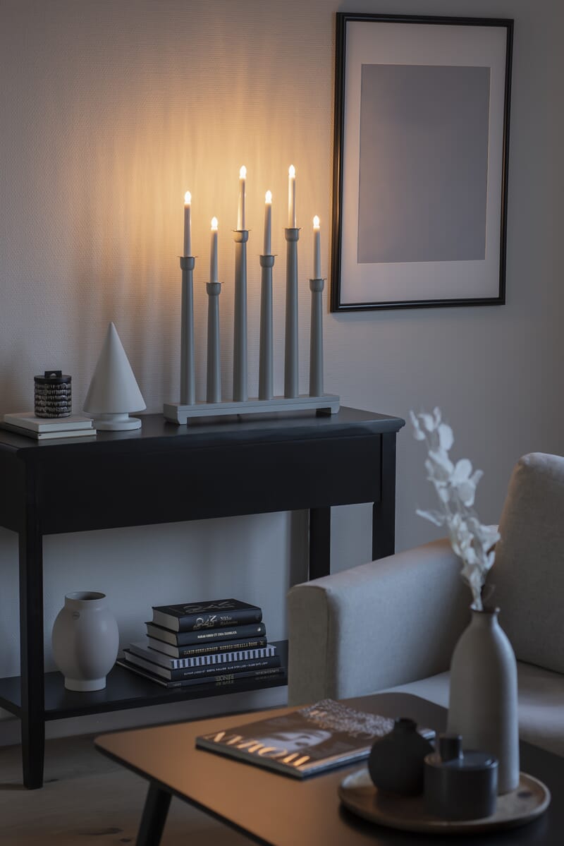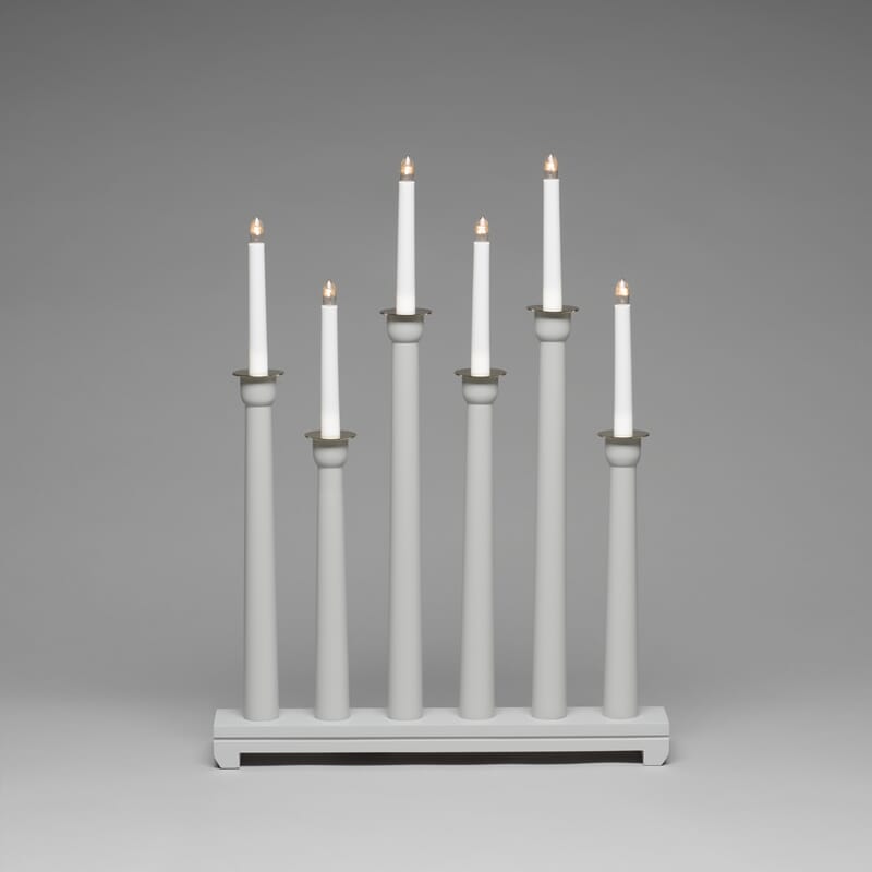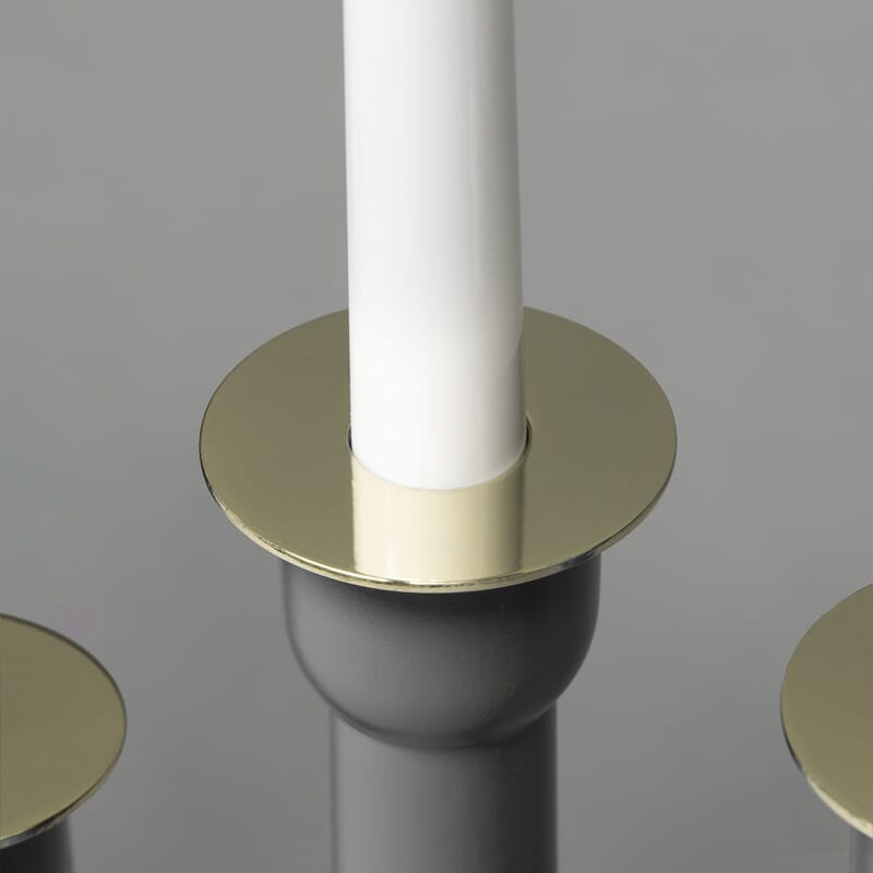 Candlestick wood 6 bulbs w.brass deco rings, grey. 230V