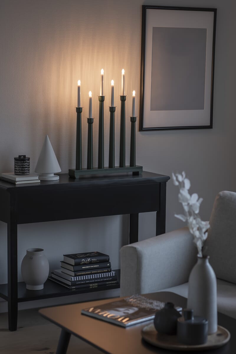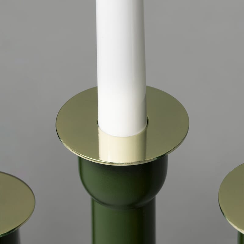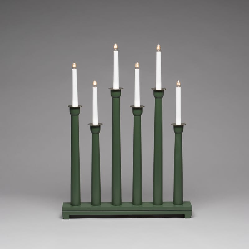 Candlestick wood 6 bulbs w.brass deco rings, green. 230V |