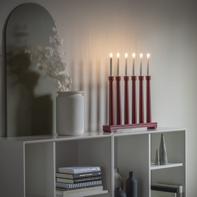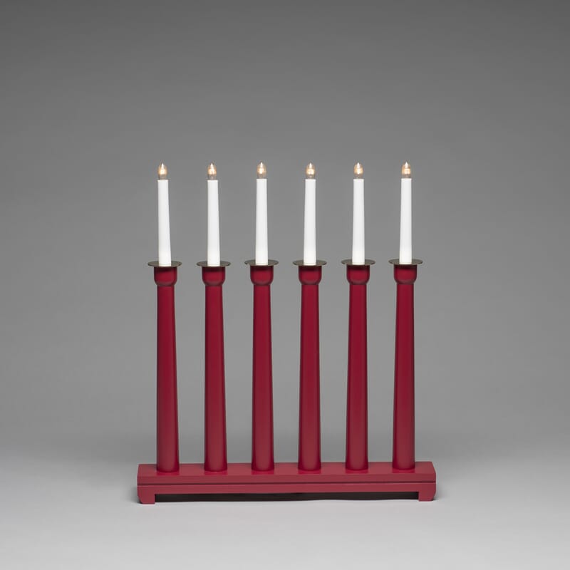 Candlestick wood 6 bulbs w.brass deco rings, red. 230V |