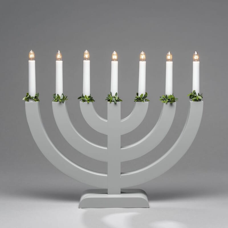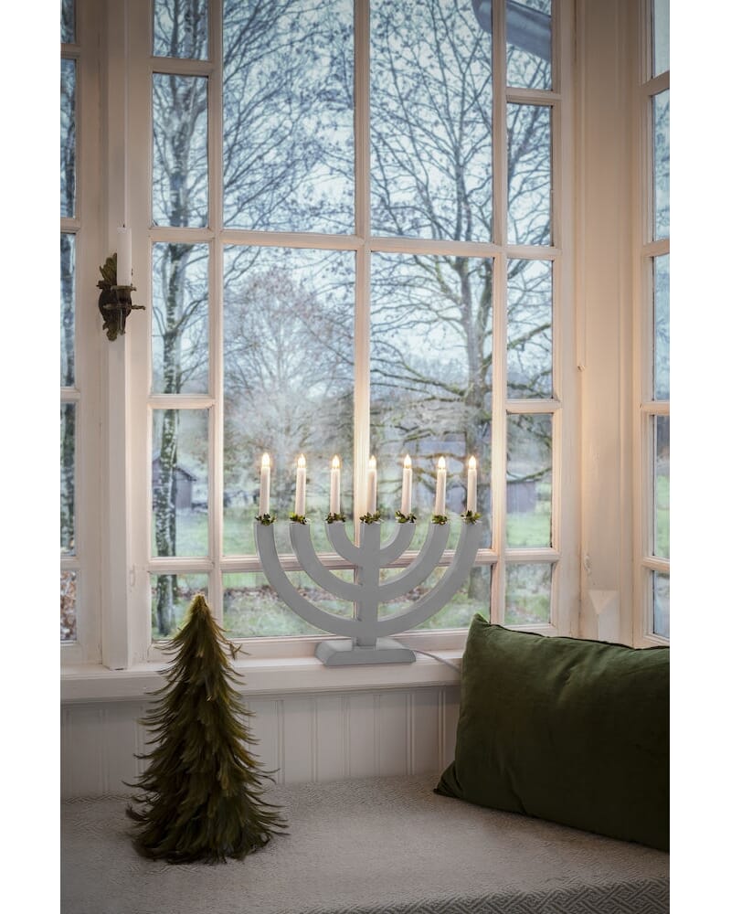 Candlestick wood 7 bulbs, grey, w.green decorations 230V |