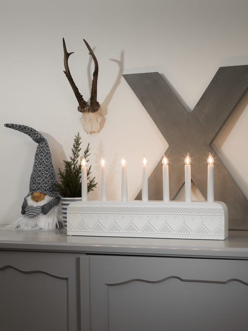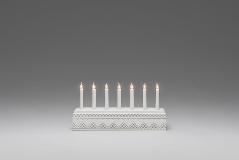 Adventstake med hjertemønster i hvitlakkert tre. Adventstaken er utstyrt med klare pærer med bøyd spiss, noe som gir den et ekstra flott utseende og ikke minst et nydelig lys.