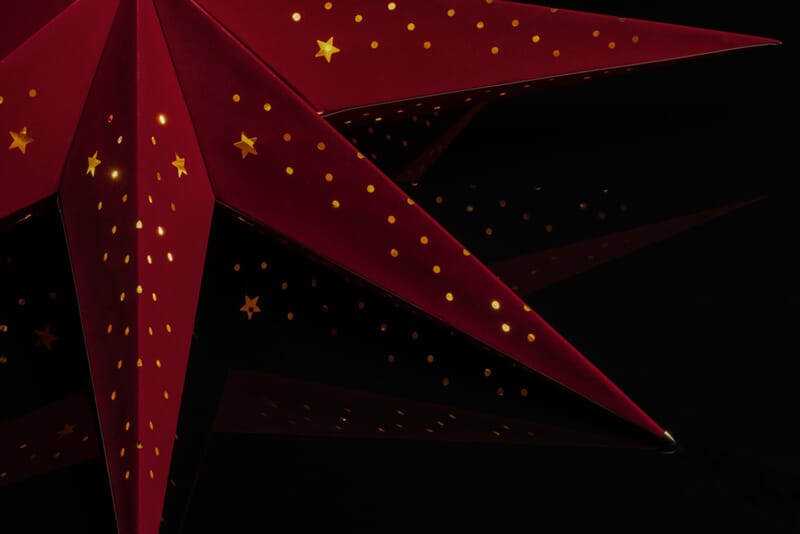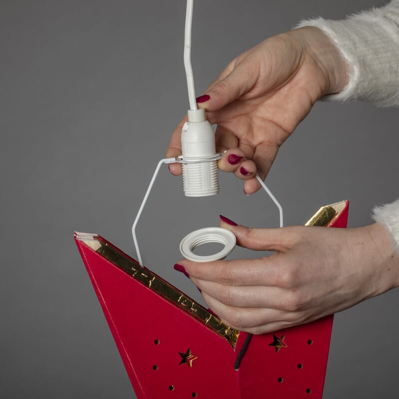 Pappstjerne 78 cm rød fløyel med gull innside. 7 armet. Inkludert oppheng. E14 lampeholder. Hvit kabel.