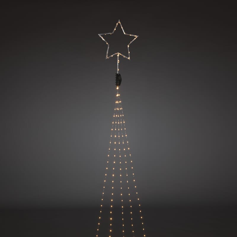 Tpppstjernen festes i toppen av treet med en klype, og ut fra denne går det 5 slinger med 274 amber LED. Slyngen er i metalltråd med innstøpe LED dioder. Fest stjernen i toppen og draper enkelt slyngene ned fra denne.