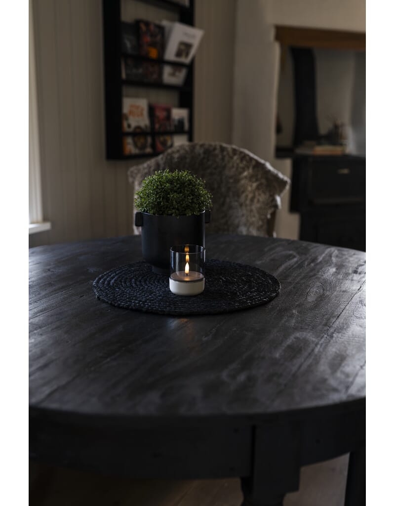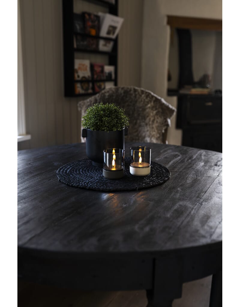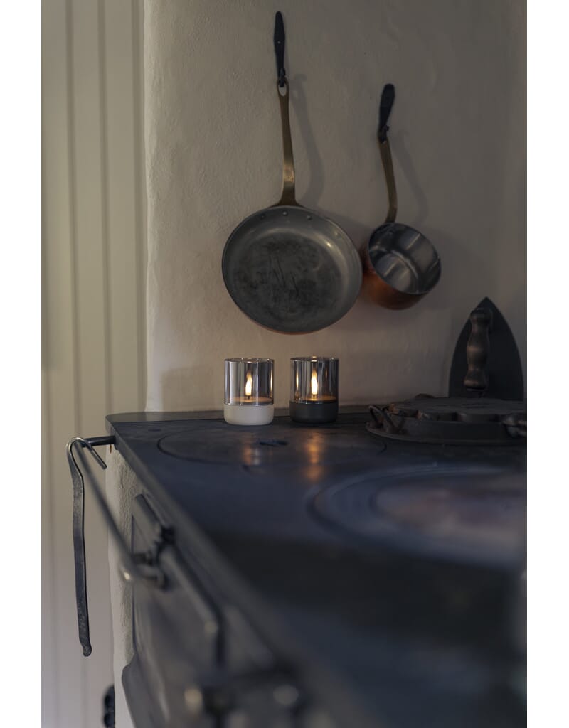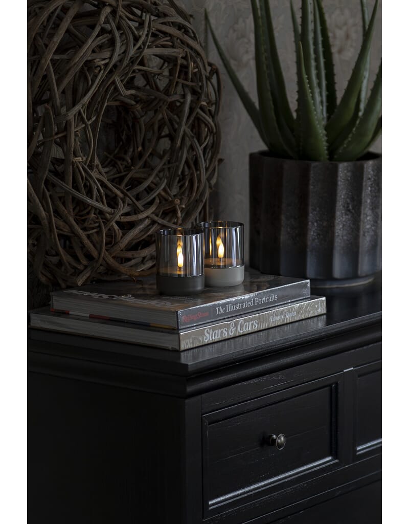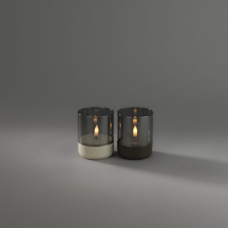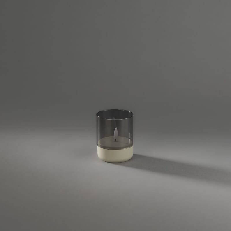 Lys med beige plastbase og røfarget glass. Timer, 6 timer.