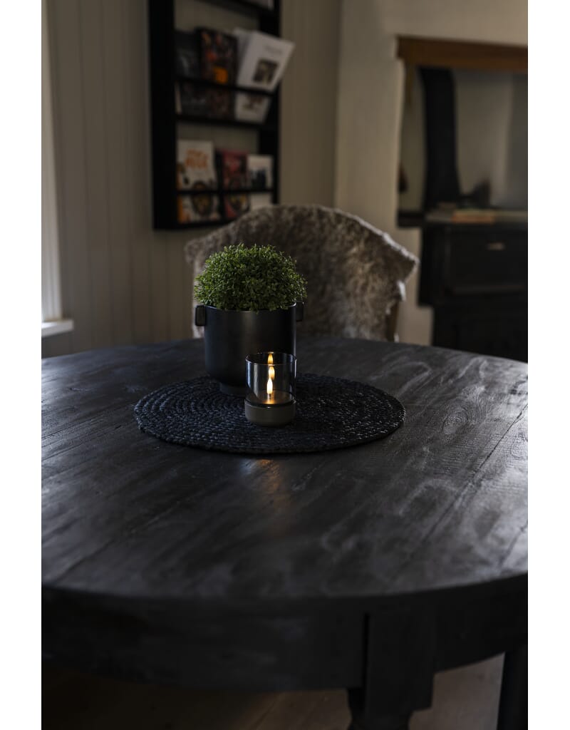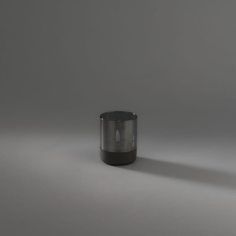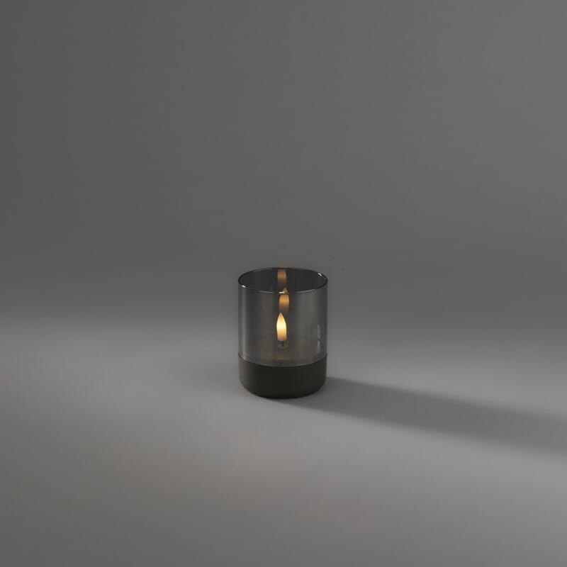 Lys med grå plastbase med røkfarget glass. Timer, 6 timer.