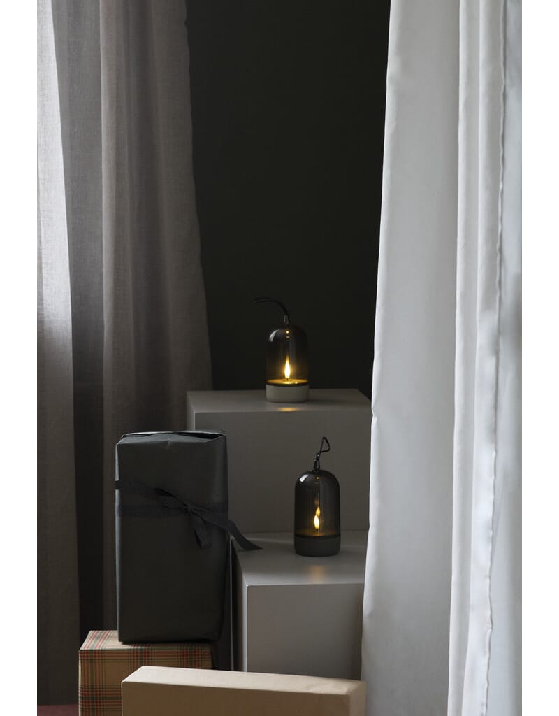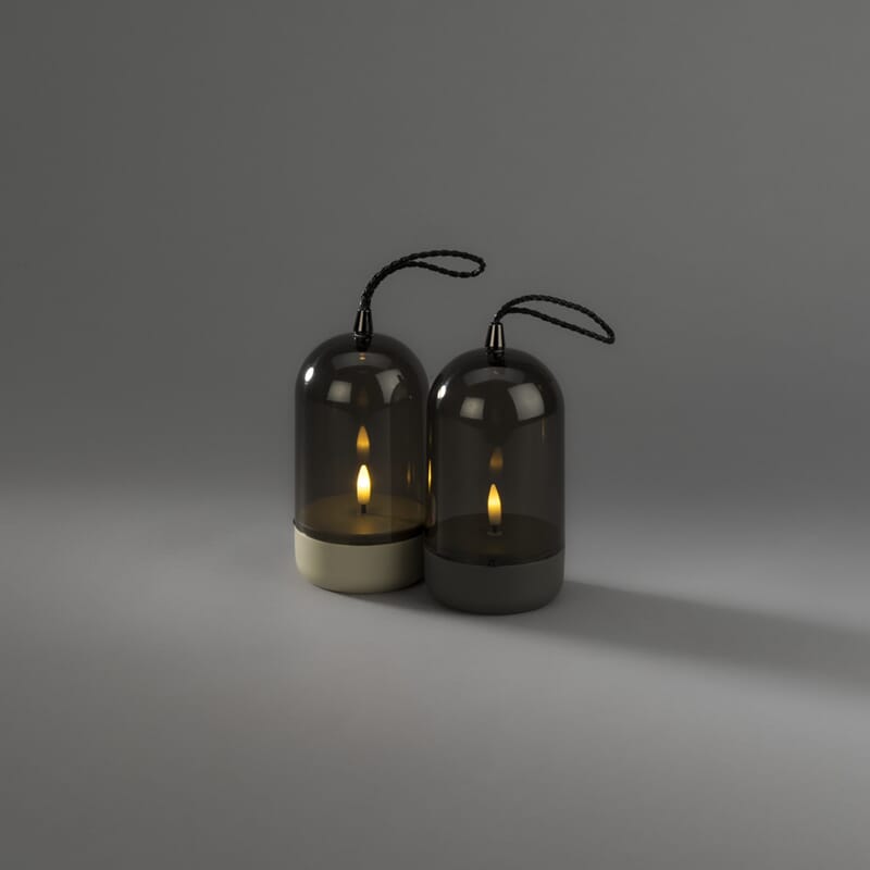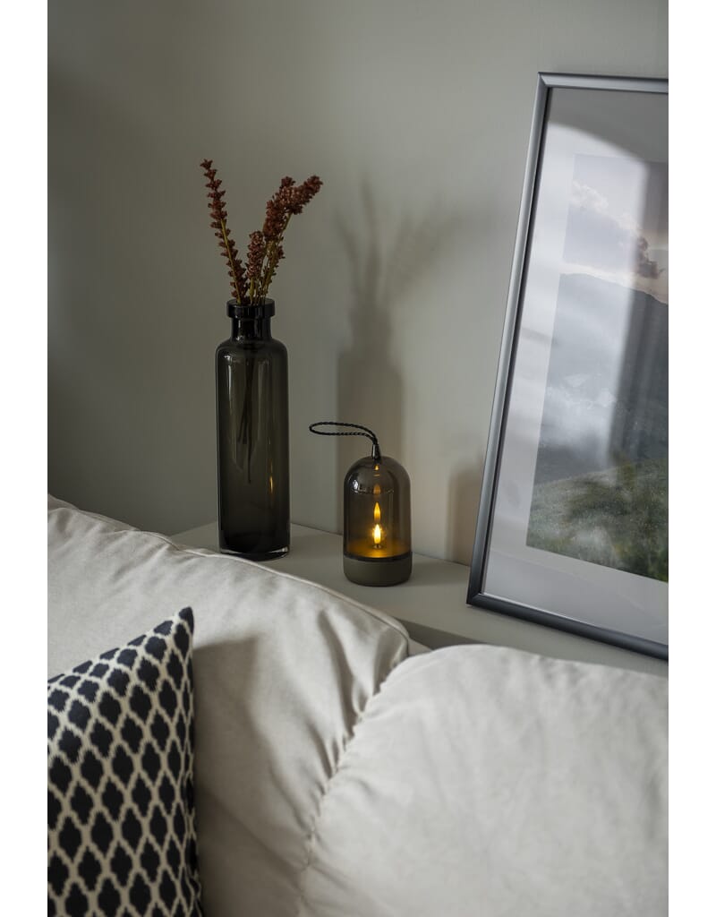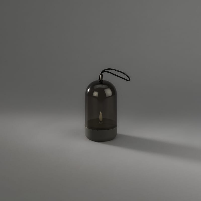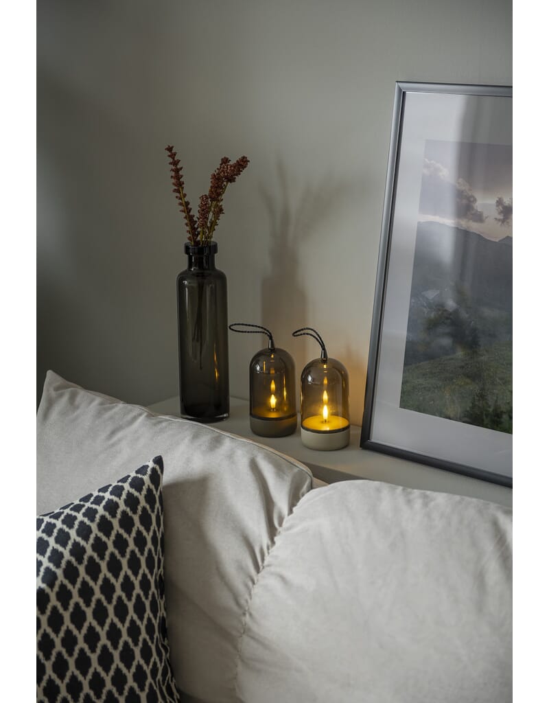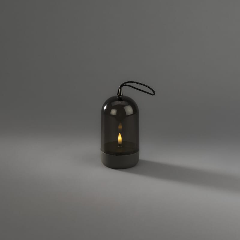 Lys med grå plastbase og røfarget glass. Timer, 6 timer.