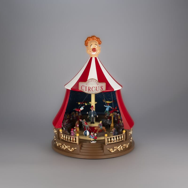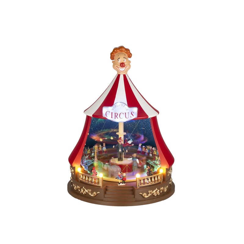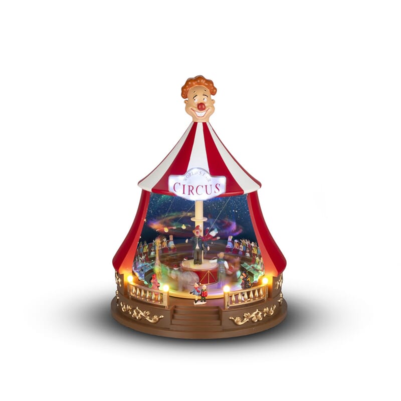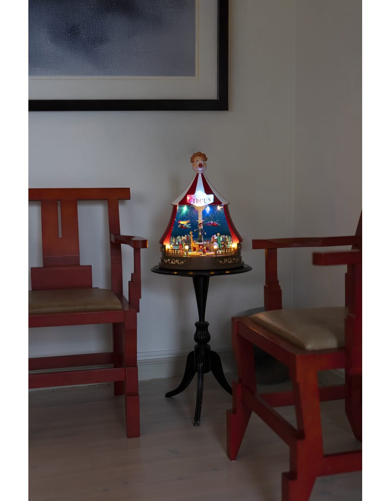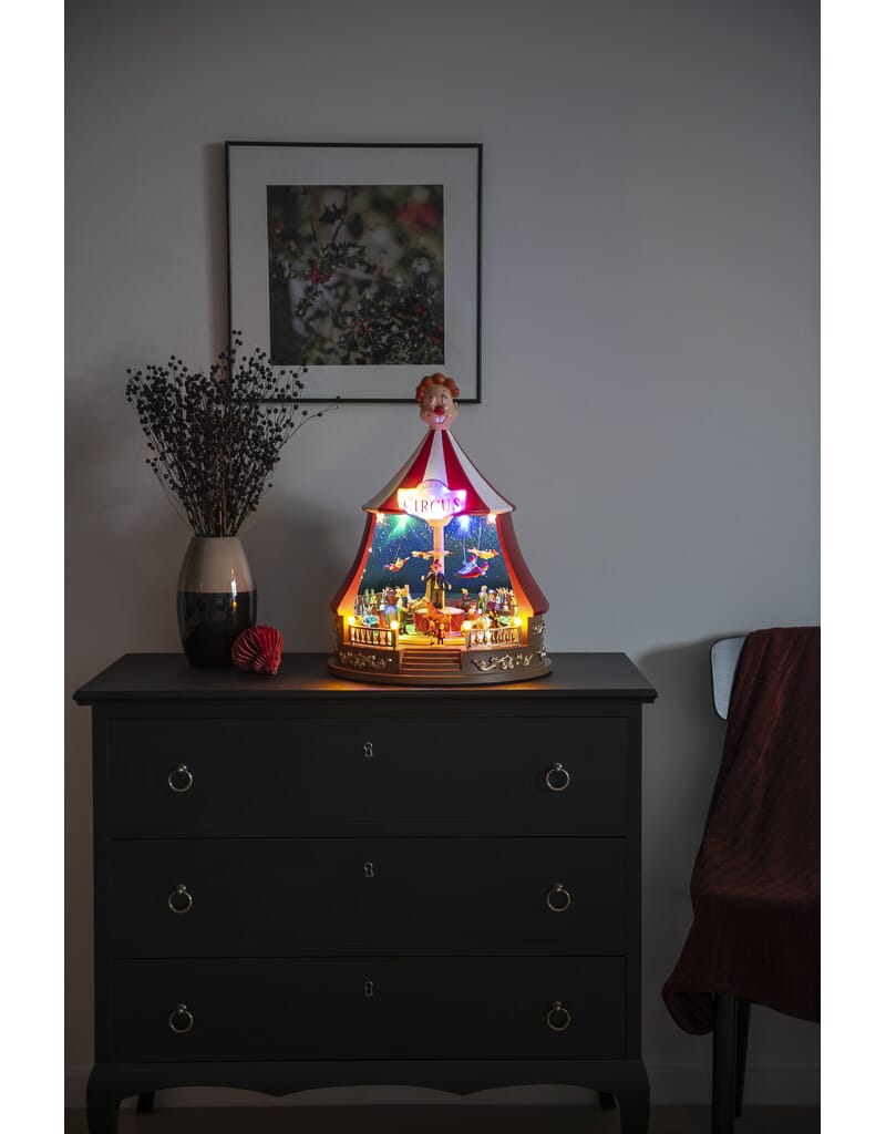 Sirkustelt med roterende dyr, julemusikk ig fargede LED. Timer, 6 timer. USB-kabel 1,8 m.