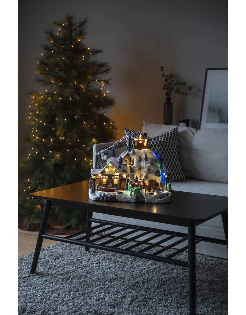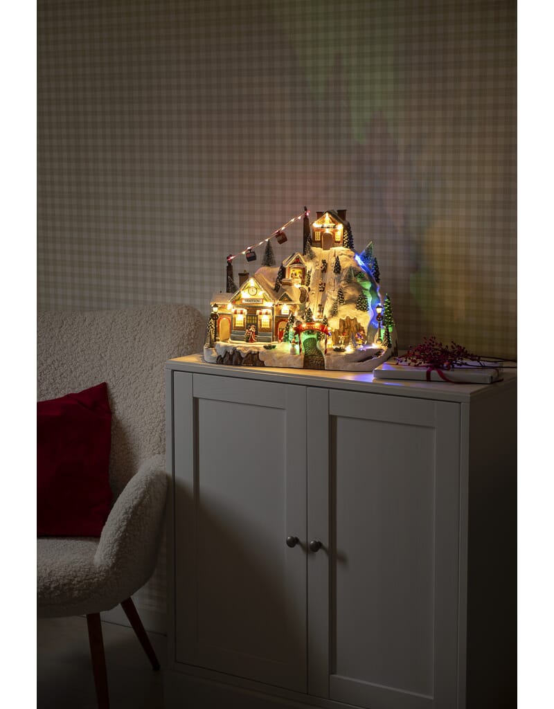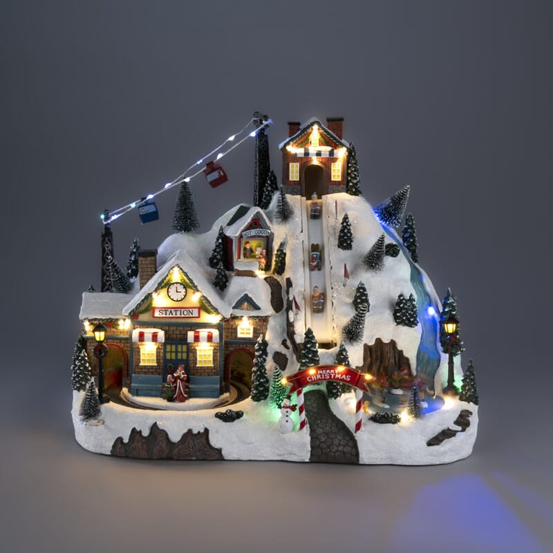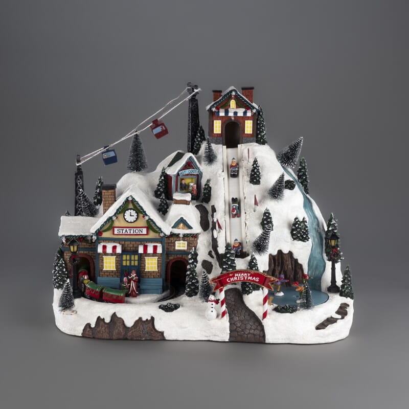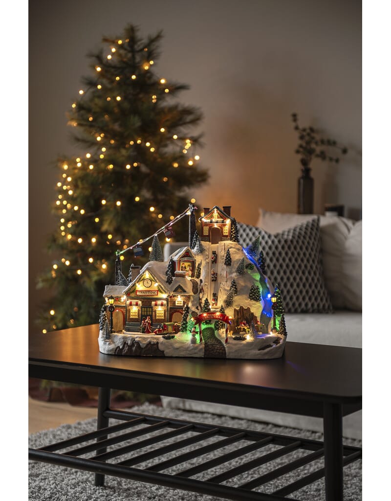 Julebt skiresort med togstasjon, heis, roterende isbane, julemusikk og flerfarget LED. Timer, 6 timer.