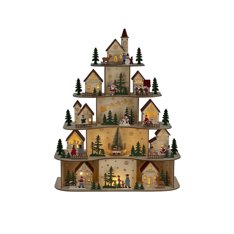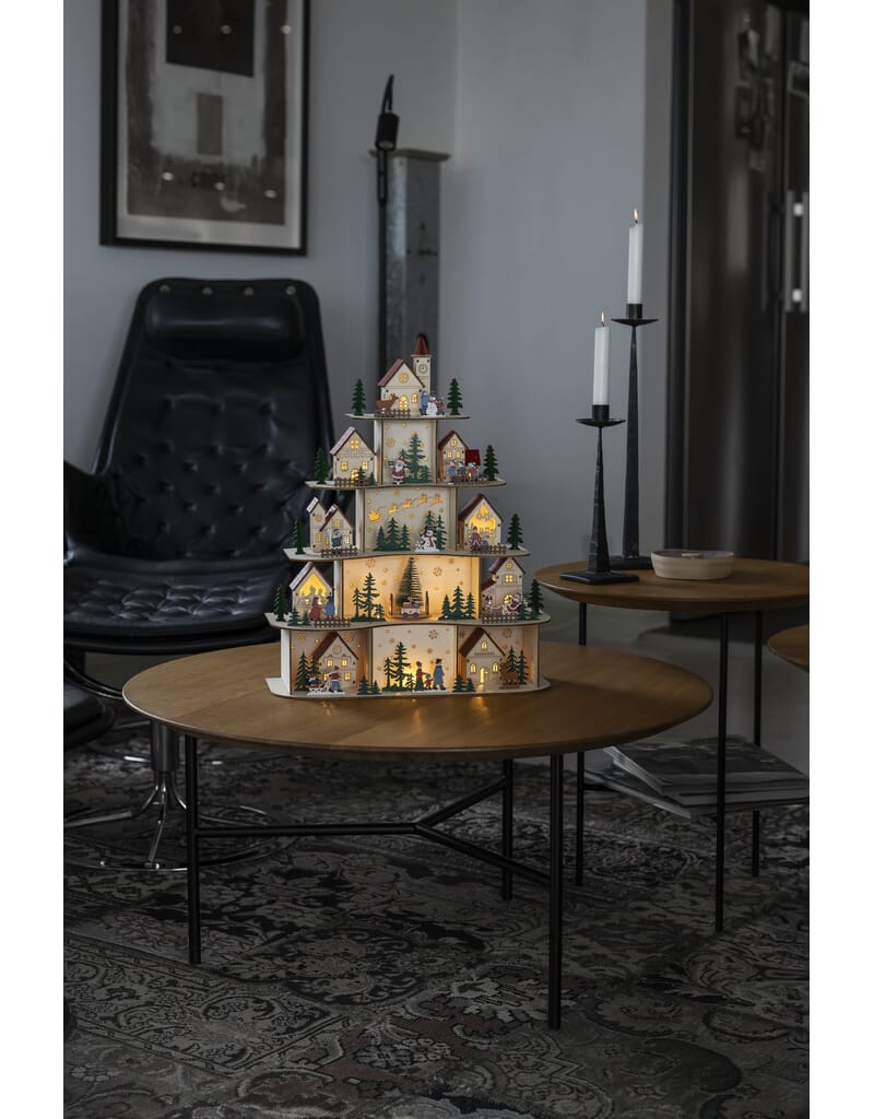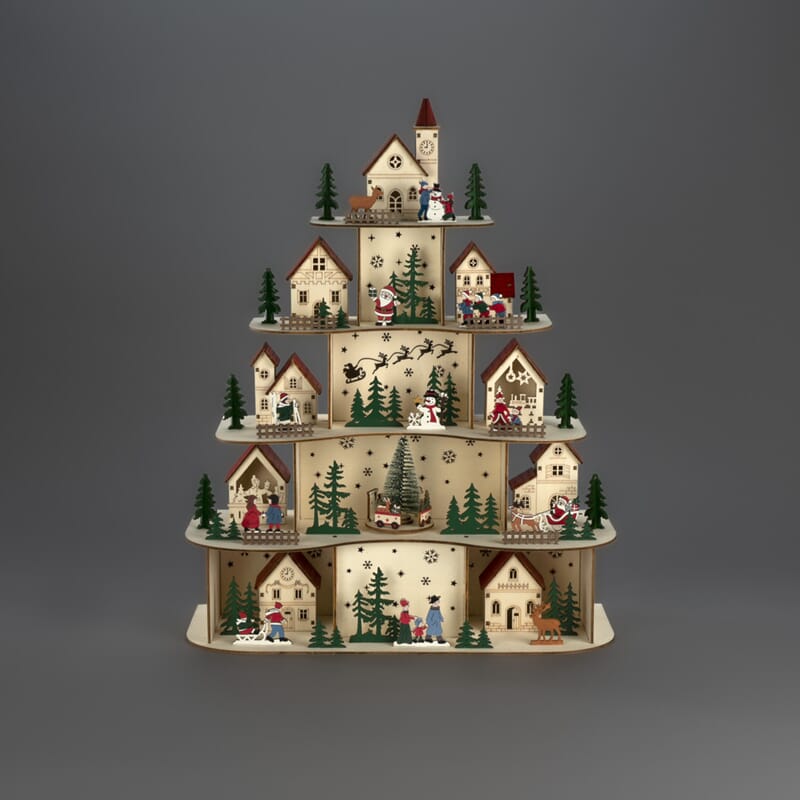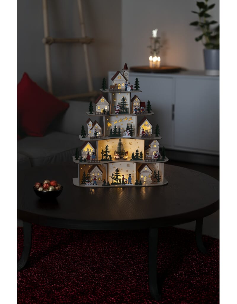 Siluett motiv med juleby i 5nivåer. Varmhvite LED; lakkert tre. Timer, 6 timer.