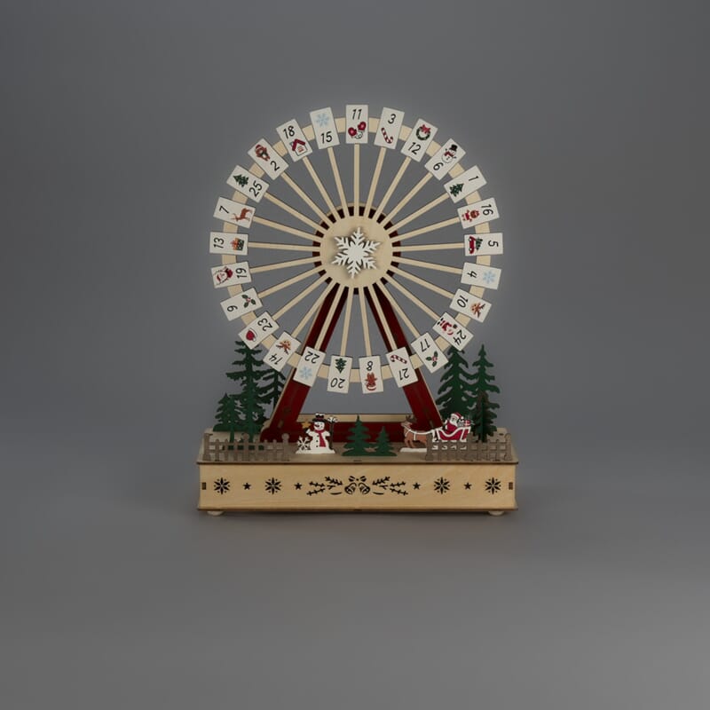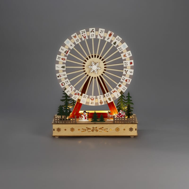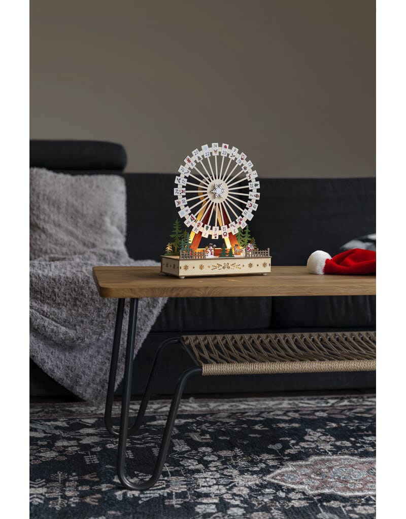 Siluett motiv med pariserhjul og kalender i lakkert tre. Varmhvit LED. USB-kabel 1,8 m.