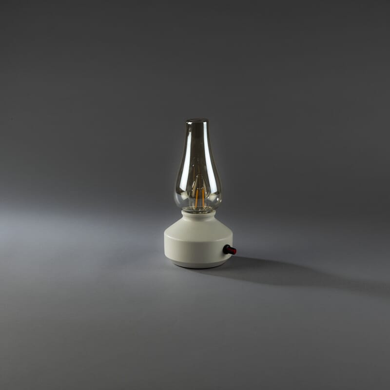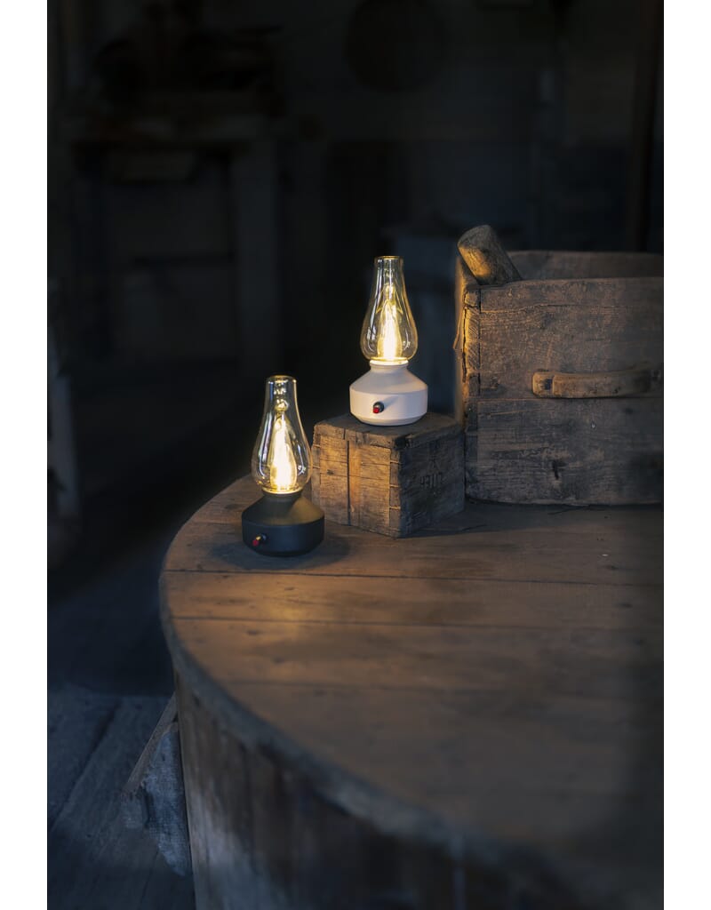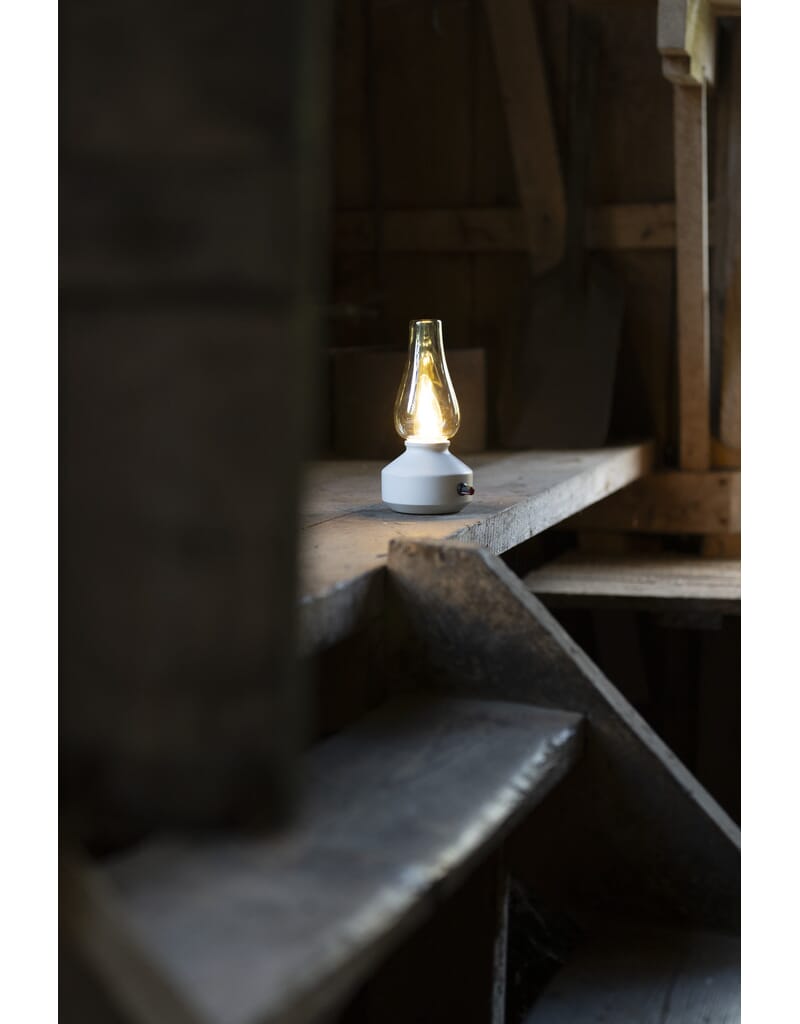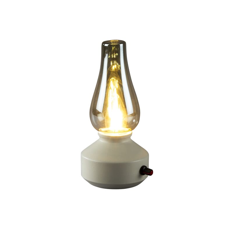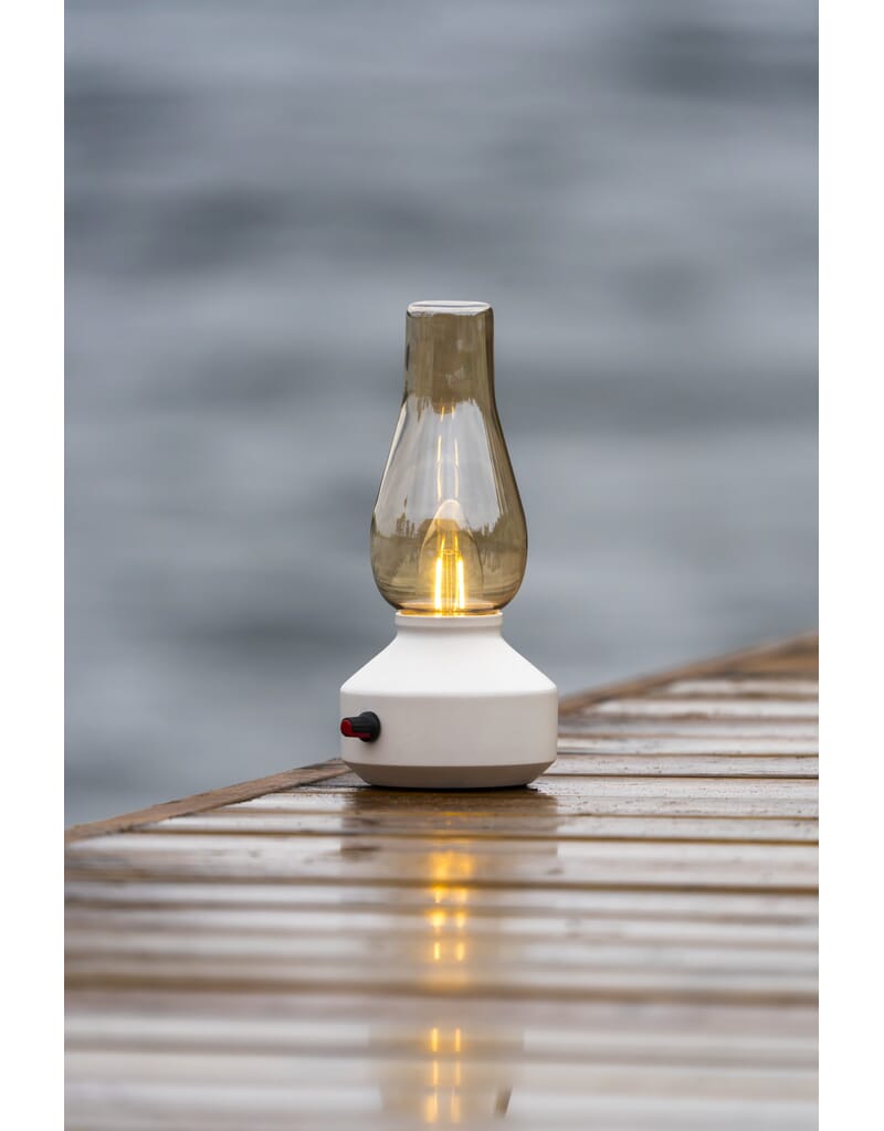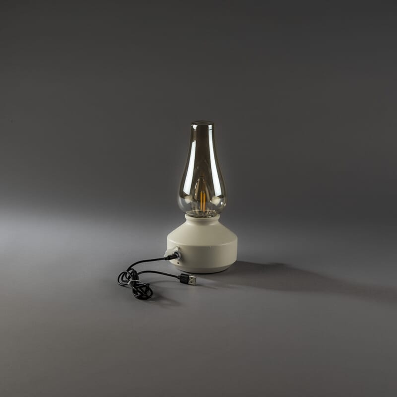 Oppladbar bordlampe med røkfarget kuppel, varmhvit LED og dimmer. USB-C kabel 1 m.