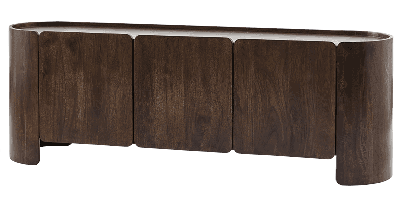 Sidebord/kommode med avrunded kanter i valnøtt mangeotre.